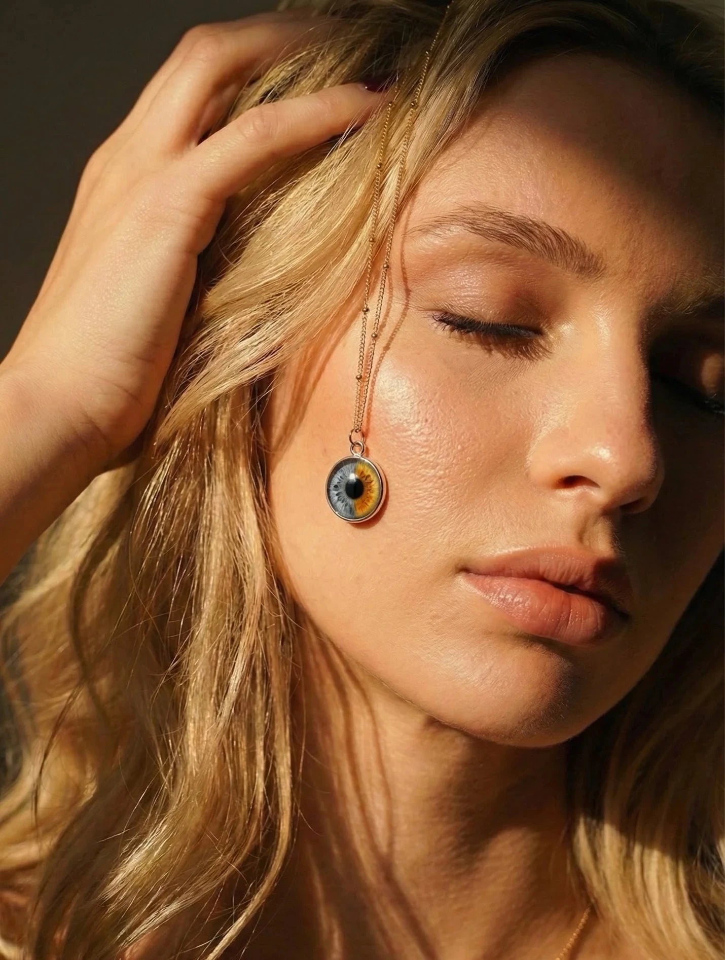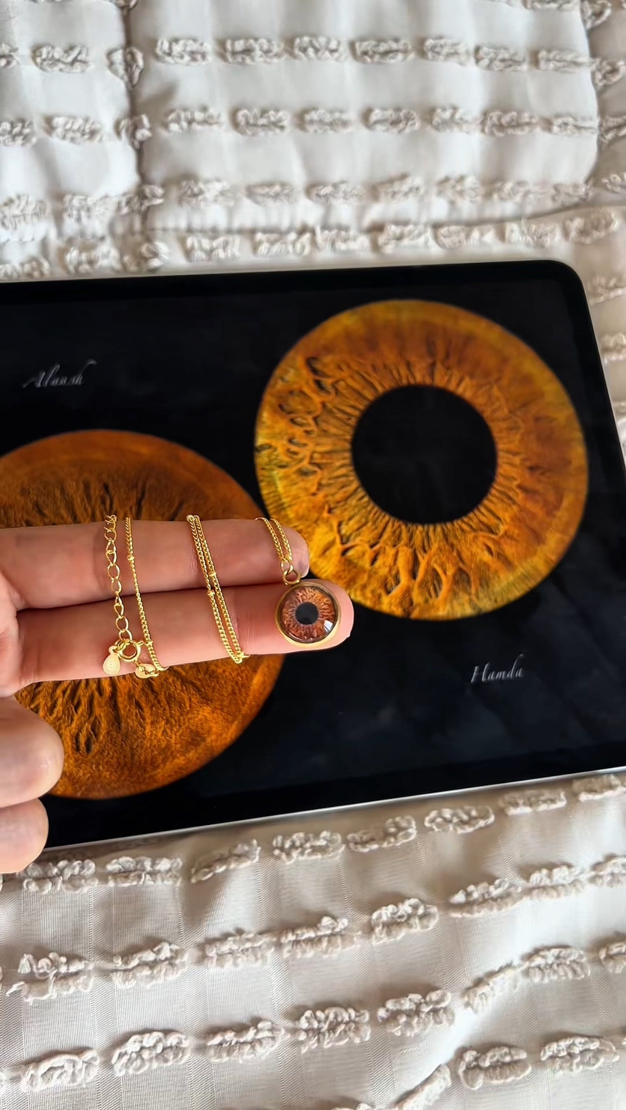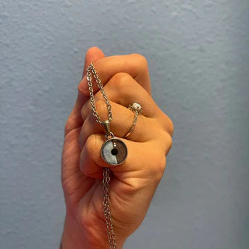 Upload one or two eye photos. Our team extracts the iris details and builds the pendant based on your selection (single eye or split eye).